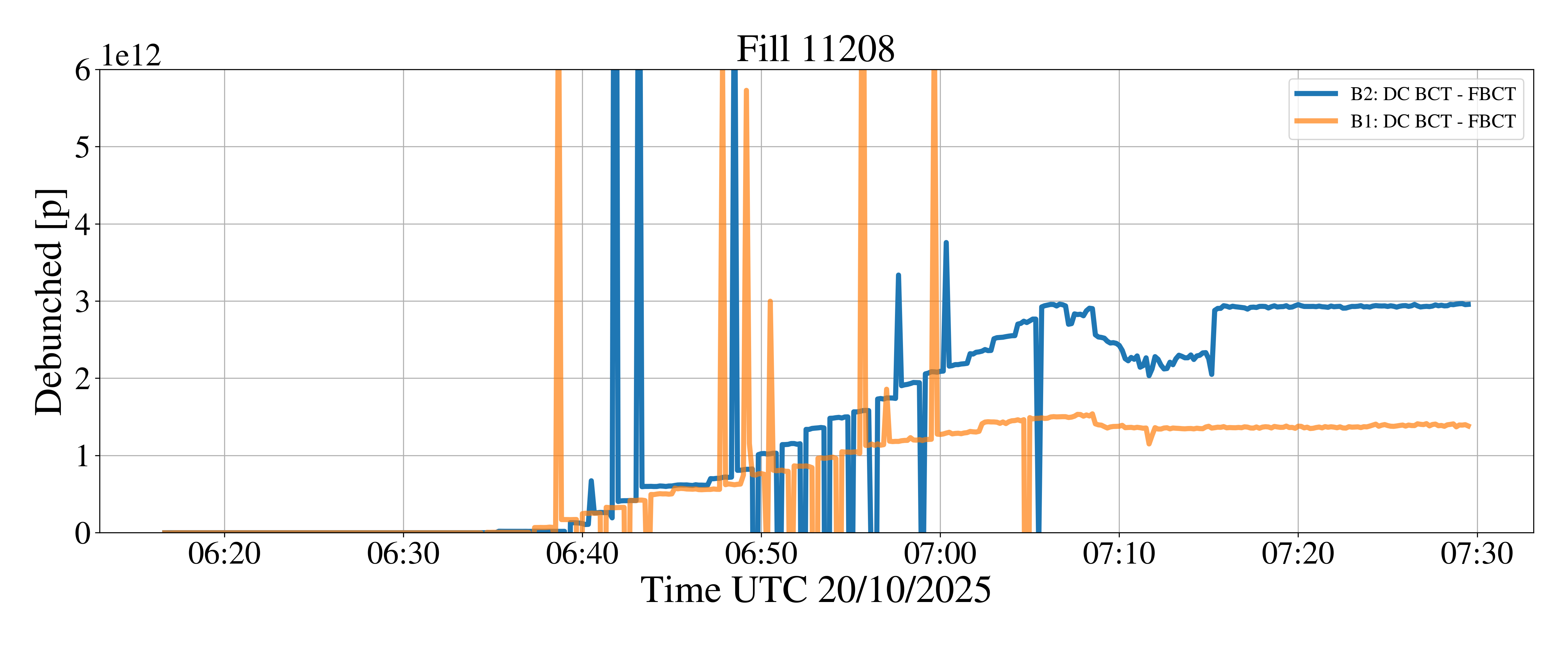 issue with debunhcing and losses when blowing up bunch length. comfirmed that it happens when opening the phase loop and not from excitation. opening of phase loop introduces synchro error spike for B1 of 10 degrees, not observed in B2.